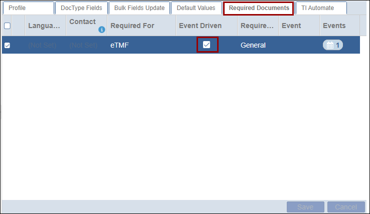 The Required Documents tab displays the document added to the Required Documents section. Users need to select the Event Driven checkbox.