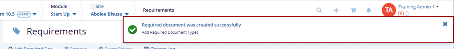 - The Add Required Document Types pop-up window is displayed with the Sites, check the