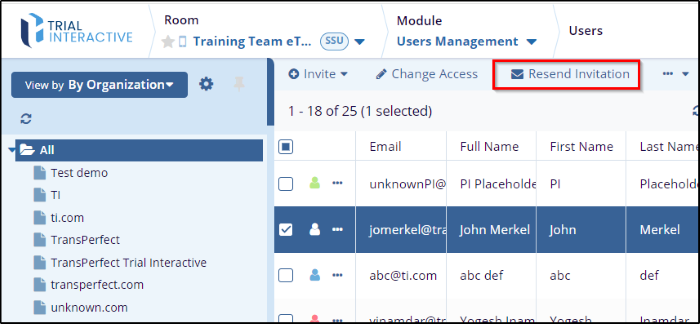 - From the list of users displayed in the right pane under the selected category, tick the checkbox for users to whom you want to resend the invitations.