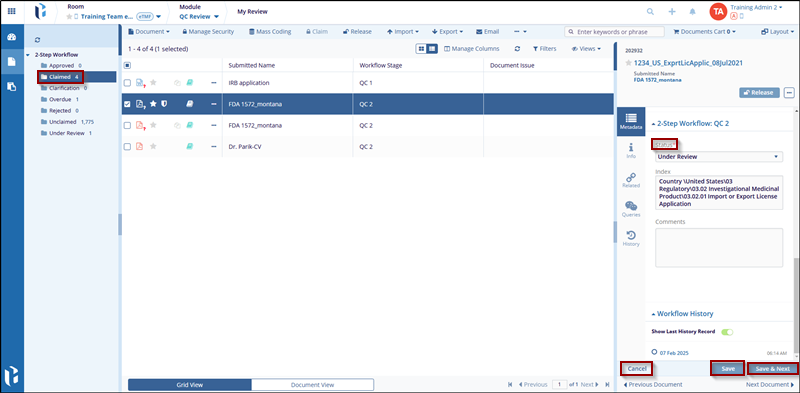 - At the right side of the screen, in the metadata panel, there is a workflow status area. This section is named for the workflow QC1.
