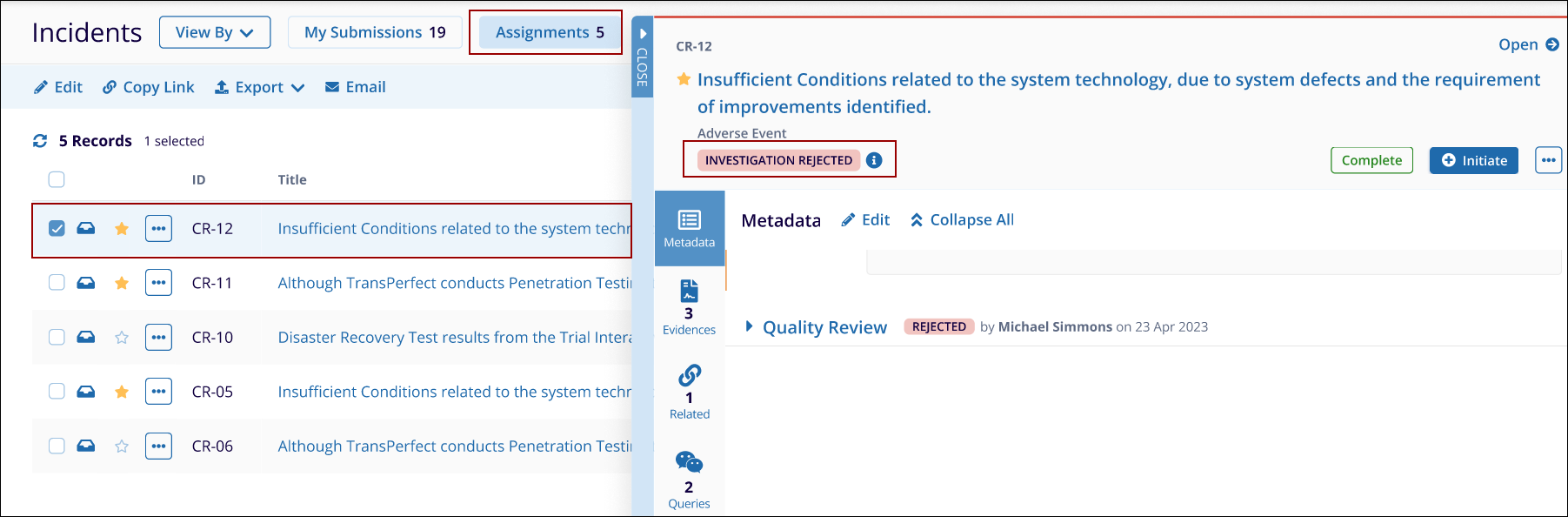 - To revise the Incident, locate the rejected incident from the My Assignment view.