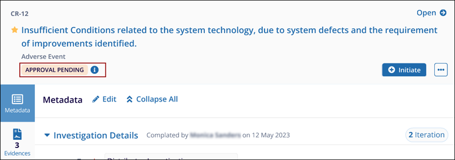 - Select the incident, the metadata screen will appear, and the status is displayed as