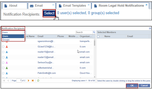 - Click Select to set up the users who will be notified when a room is put on legal hold.