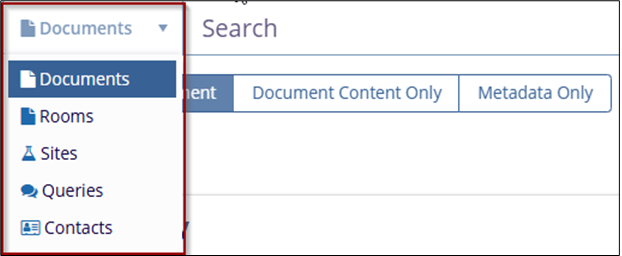 Users can select from five categories: Documents, Rooms, Sites, Queries, and Contacts. Depending on the selected category, the search results are refined accordingly. For documents, users can further filter by content, metadata, or both. Users can execute this search from the Home Page Search functionality.
