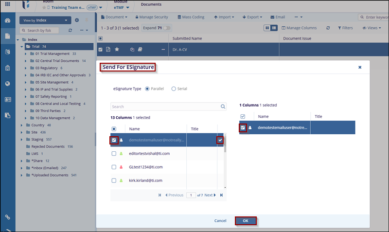 - Choose the user or users who will need to sign the document by moving them from the left side to the right side.