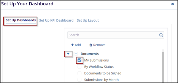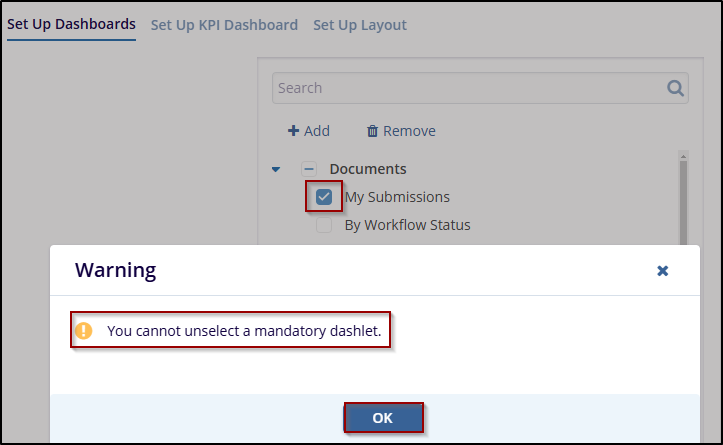 - In the Document dashlet, unselecting the checkbox for My Submissions, a warning message window will pop up stating: You cannot unselect a mandatory dashlet.