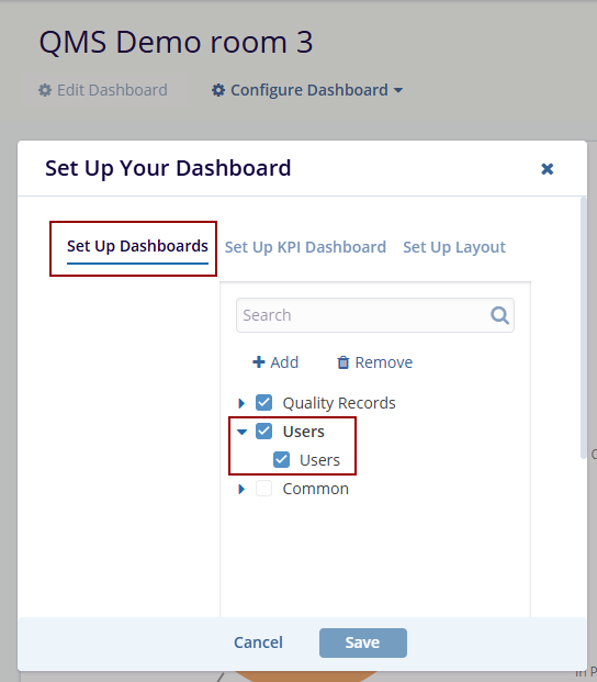 The Set-Up Dashboards allow users to customize their dashboards by adding, removing, or managing dashlets. Dashlets are individual components that display specific types of data or functionality on the dashboard, helping users personalize their view to highlight the most relevant information.