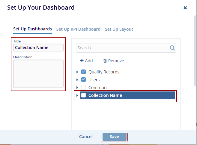 - Click on the Add button, and a new entry will appear under the list of available dashlet as (collection Name). While adding a new dashlet, the user has to mention the Title and Description in the left-side fields.