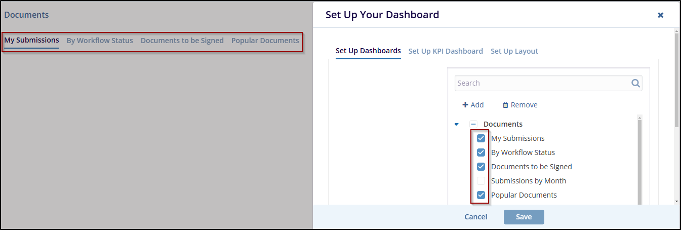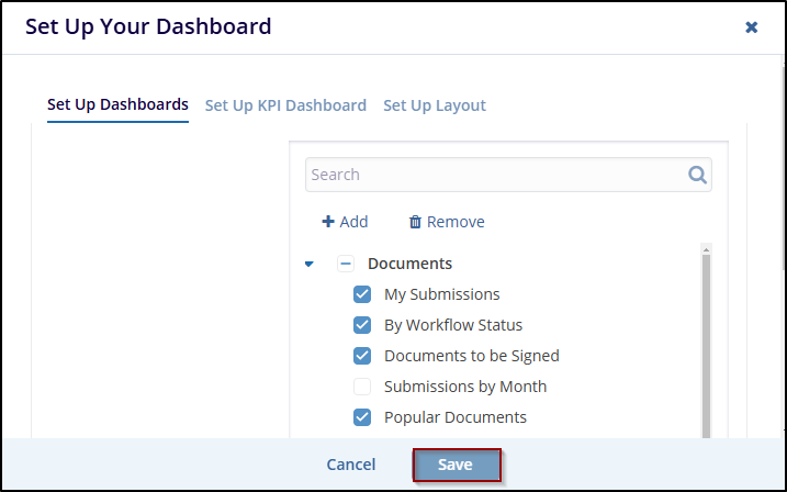The Set-Up Dashboards tab allows users to customize their dashboards by adding, removing, or managing dashlets. Dashlets are individual components that display specific types of data or functionality on the dashboard, helping users personalize their view to highlight the most relevant information.