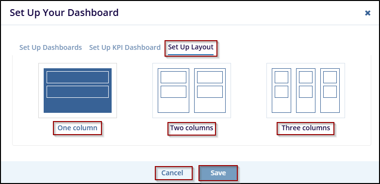 The Set-Up Layout allows users to customize the visual structure of the dashboard by choosing a column-based layout. This ensures that the dashboard is organized according to user preferences. The user has the option to select from – One, Two, or Three Columns.