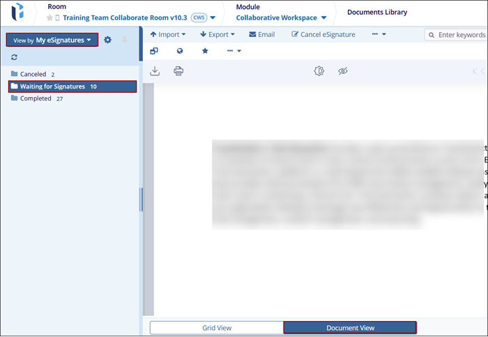 - The Document View opens by default with My eSignature view applied and the Waiting for