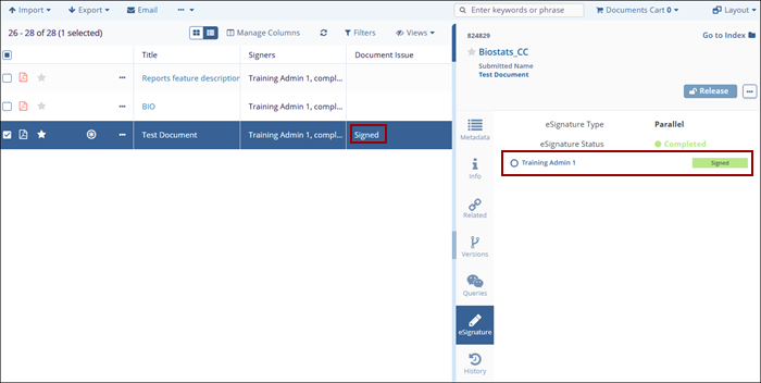 - Select the eSignature tab in the metadata panel and enter a reason from the available dropdown options.