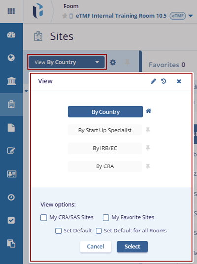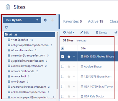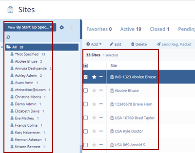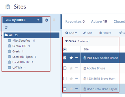Clicking the Sites tab from the vertical menu bar leads you to the Sites section. This is where the Start-up Specialists will perform their functions, and the users of the sites are allowed to submit and approve documents specific to the sites.
