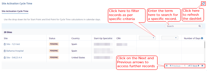 The Site Activation dashlet provides an overview of the available sites with their status in the SSU module. The tracking of a cycle time is a must for activating sites in clinical trials as this metric enables researchers and stakeholders to identify potential bottlenecks and streamline the process, ultimately accelerating the timeline for bringing life-saving treatments to patients.