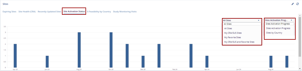 - In the Site Activation Progress dropdown menu, choose the desired Site Activation Progress type to adjust the chart based on specific activation criteria or milestones.