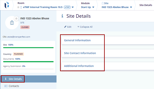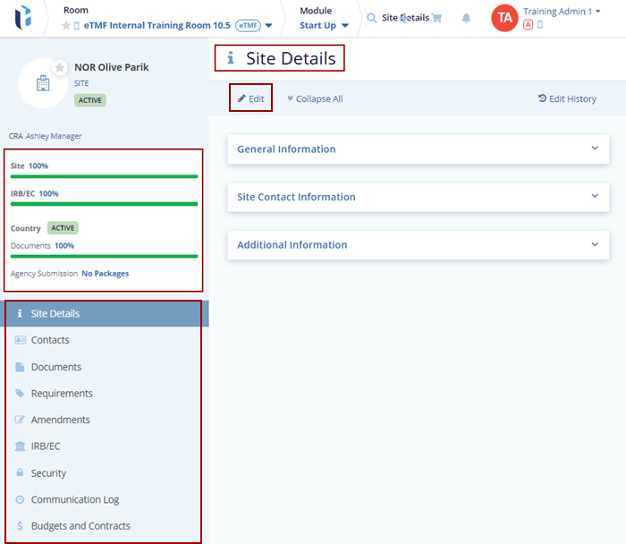 The Site Details page, displays a progress bar for the Site, Country, and IRB/EC, along with an activation notice based on the percentages shown.