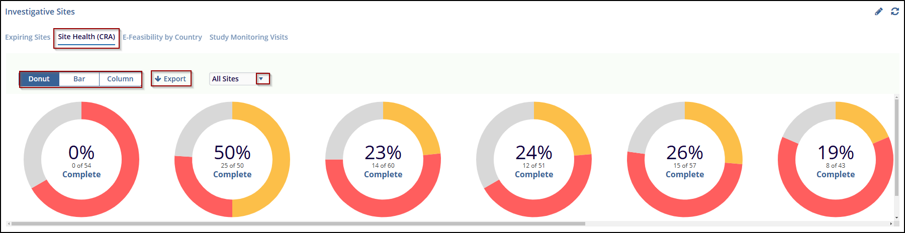 The Site Health (CRA) tab provides a summary of the completion status for multiple sites, allowing users to monitor site progress effectively. This tab features three chart types—Donut, Bar, and Column—that display the percentage of tasks completed out of the total for each site. Users can also Export the data for external reporting or analysis. Additionally, the All Sites dropdown menu allows for filtering, enabling users to narrow down the view to specific sites or groups as needed.