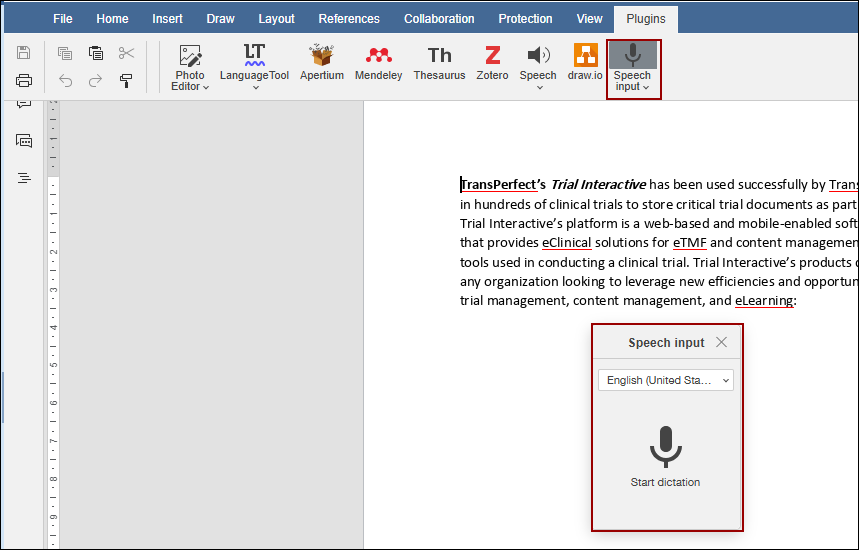 The Speech Input plugin in OnlyOffice enables users to convert speech into text effortlessly. The Web Speech API recognizes spoken words and inserts them directly into documents, streamlining productivity and minimizing typing effort. The plugin supports multiple languages, including English, French, German, Italian, Spanish, Portuguese, Turkish, Chinese, and more.
