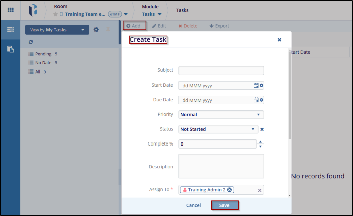 - Click the Add button located in the top menu, this will open the Create Task window.