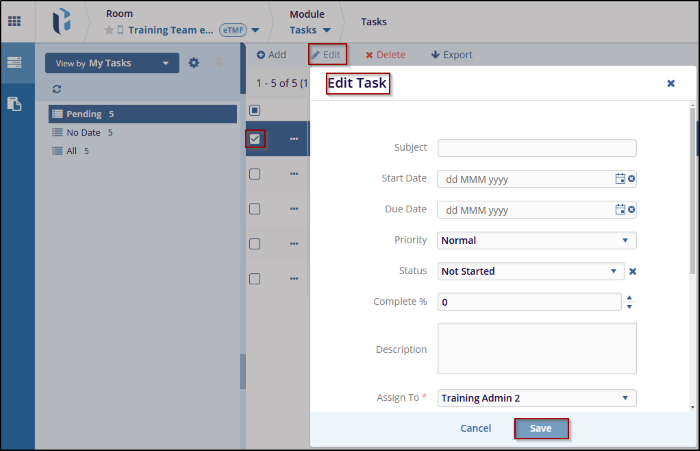 - Select the single task from the grid and document view and click the Edit button at the top menu.