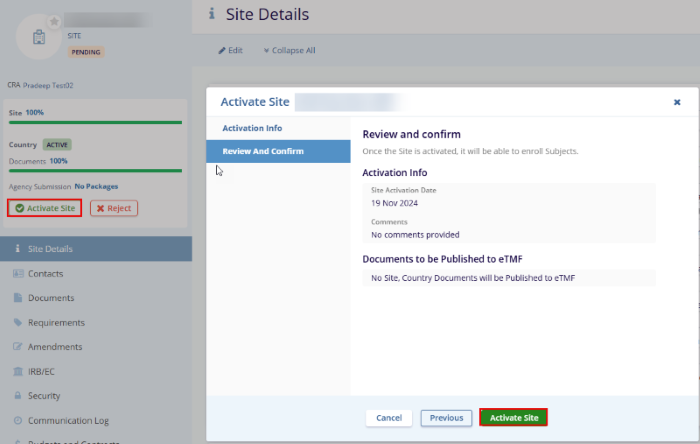 A site can be activated once all essential documents are submitted, approved, and the Essential Documents Progress Bar reaches 100%. Only Site Activation Members can activate the site, triggering automatic naming, routing, and filing of documents in the finalized eTMF. Administrators can configure these automation settings in Study Start-Up. The Activate/Reject button appears on the Site Profile Dashboard upon final approval by the Start-Up Specialist and Regulatory Reviewer.