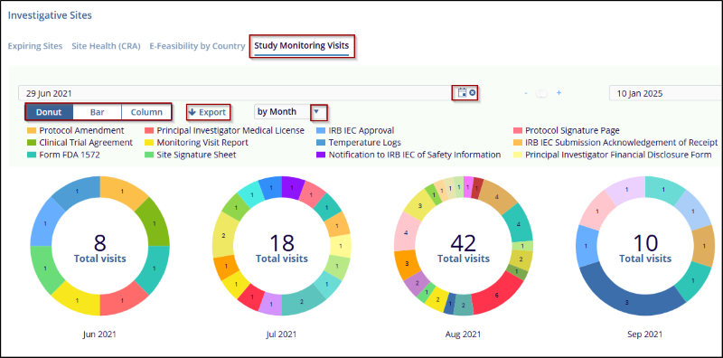 The Study Monitoring Visits tab provides a breakdown of the monitoring visits conducted over specific periods. Users can view visit data by month and year, with each circular chart displaying the total number of visits for that time and color-coded segments representing various document types (e.g., PI Curriculum Vitae, Protocol Amendment, Administrative Changes). The tab offers flexibility to change the chart type between Donut, Bar, and Column views, and an Export button to download the data. The date range can be adjusted using the date fields to focus on specific periods, helping users track and analyze visit trends over time.