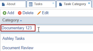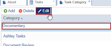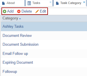 Task categories can be created, edited, or deleted through the buttons on the Task Category dashlet.