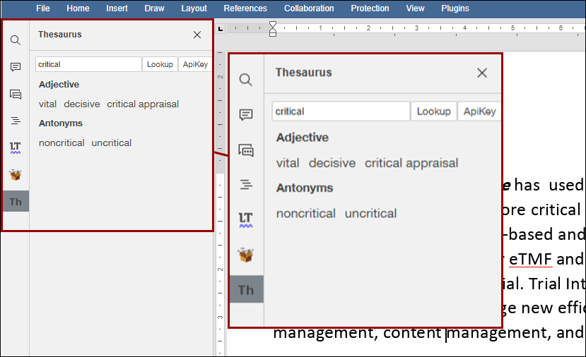 The Thesaurus plugin for OnlyOffice allows users to easily find and replace words with synonyms directly within the editor. This enhances vocabulary and improves writing quality by providing quick access to word alternatives, enabling more refined and diverse content without leaving the workspace.