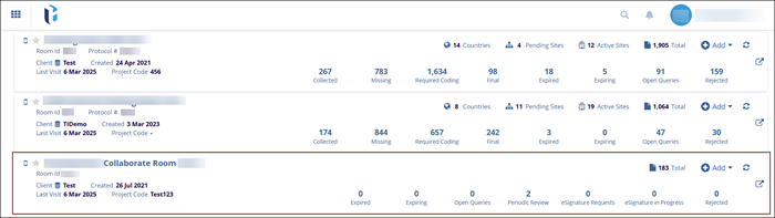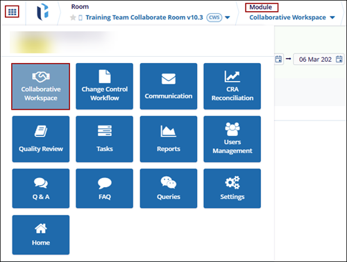 Collaborative Workspace is a repository for project management-related documents; some of the documents in this room will be moved to the eTMF room. Collaborative workspace has a reference to a study room.