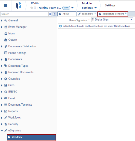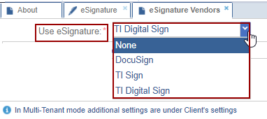 Vendors The e-signature vendor available to the user is determined by the vendor selected by your organization. Click the Use E-Signature dropdown to select the vendor. Refer to the screenshot below: