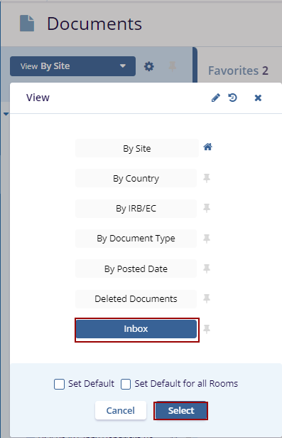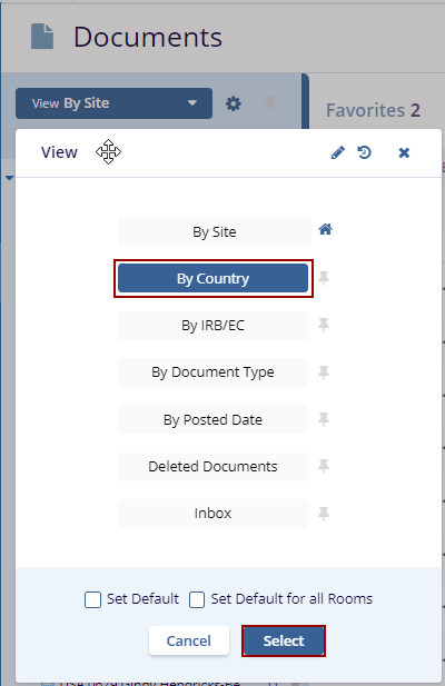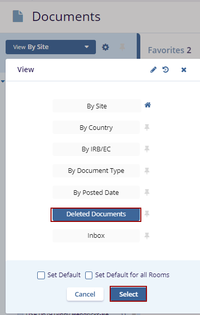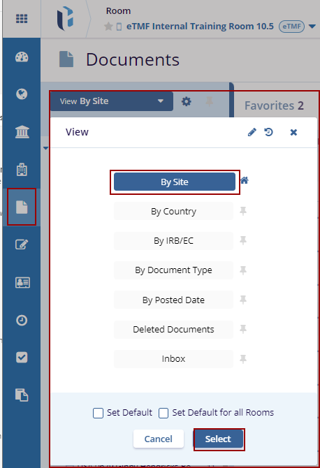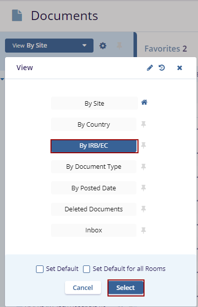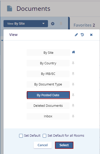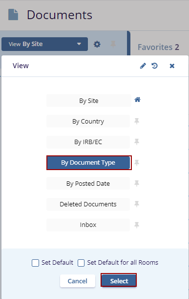 The Current View Dropdown offers seven views. Click the View By dropdown menu to view the options. Click the Select button displayed at the bottom of the window to view the specific documents.