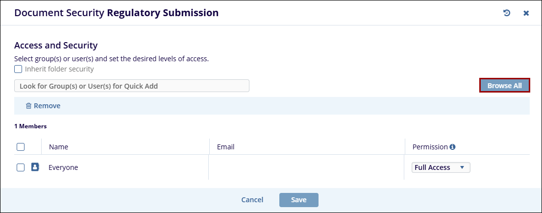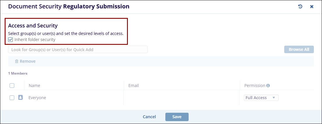 Administrator-level users can apply specific document-level security via the Document Activities menu. Selecting View Document Security will open the Document Security window.