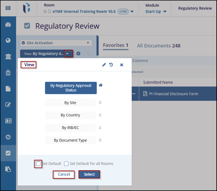 The View Dropdown allows users to select options based on requirements such as By Regulatory Approval Status, By Site, By Country, IRB/ EC, and Document Type.