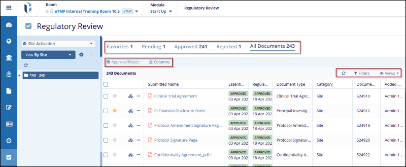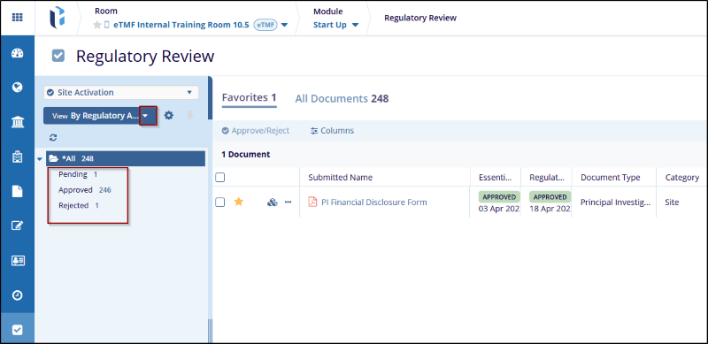 - By Regulatory Approval Status: The By Regulatory Approval Status groups all the documents as per their review status, i.e., Approved, Rejected, and Pending. Clicking a review status group from the left panel will display the documents belonging to the particular review status group in the grid pane.