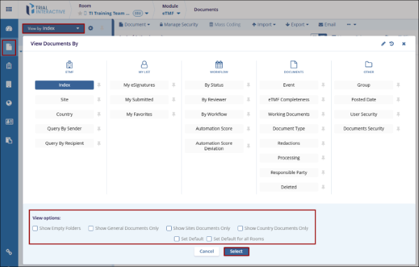 - Open the Documents modal from the left-hand navigation pane and click the View By dropdown. The index view is applied by default.